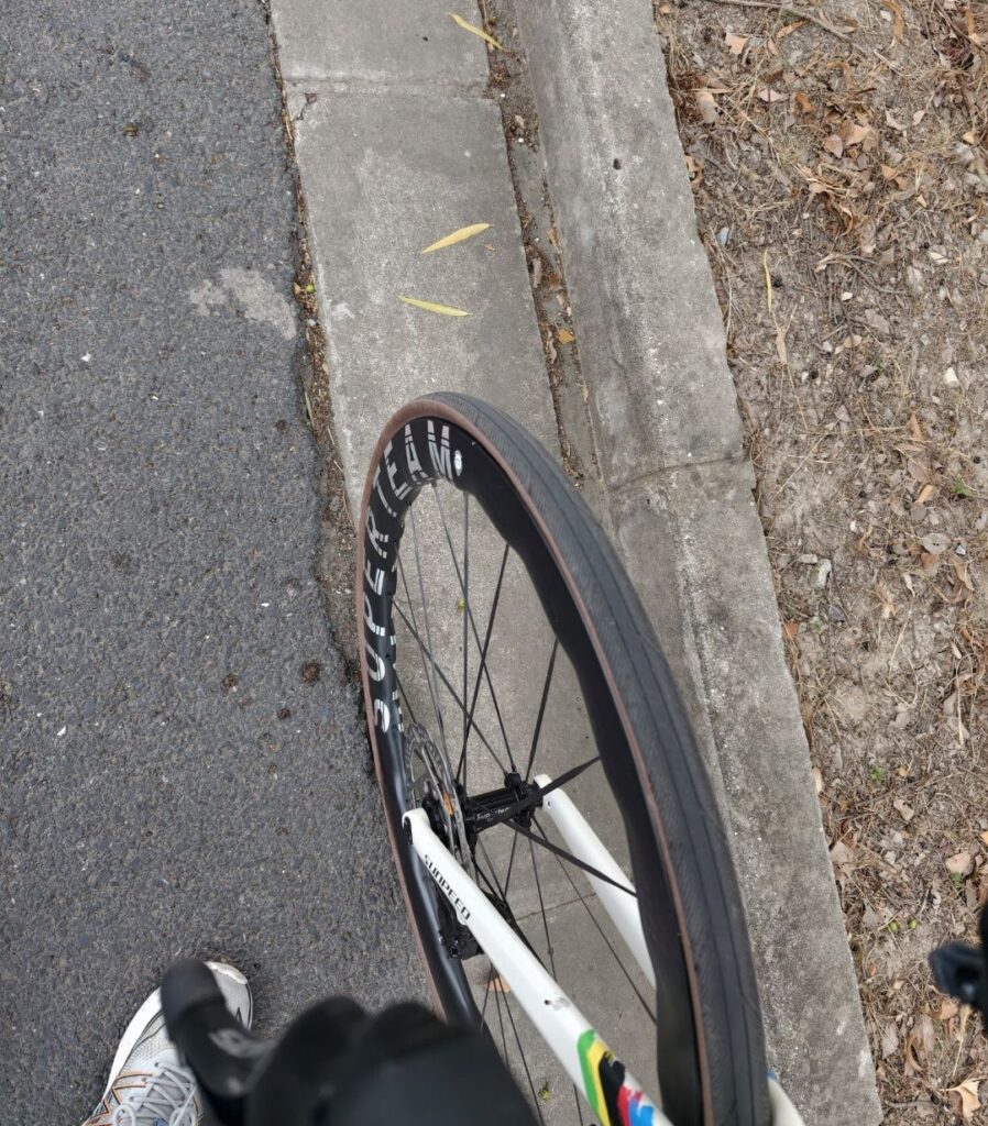 原本应该是一路顺风吃完返程的节奏,但是在柘林镇的公路上出了意外:高速前进中的前轮陷进了因年久老化在而沥青和路牙之间形成的大缝里并且摩擦了数米。结果因为摩擦导致前轮外胎钢圈脱轨,一小部分歪了出来。